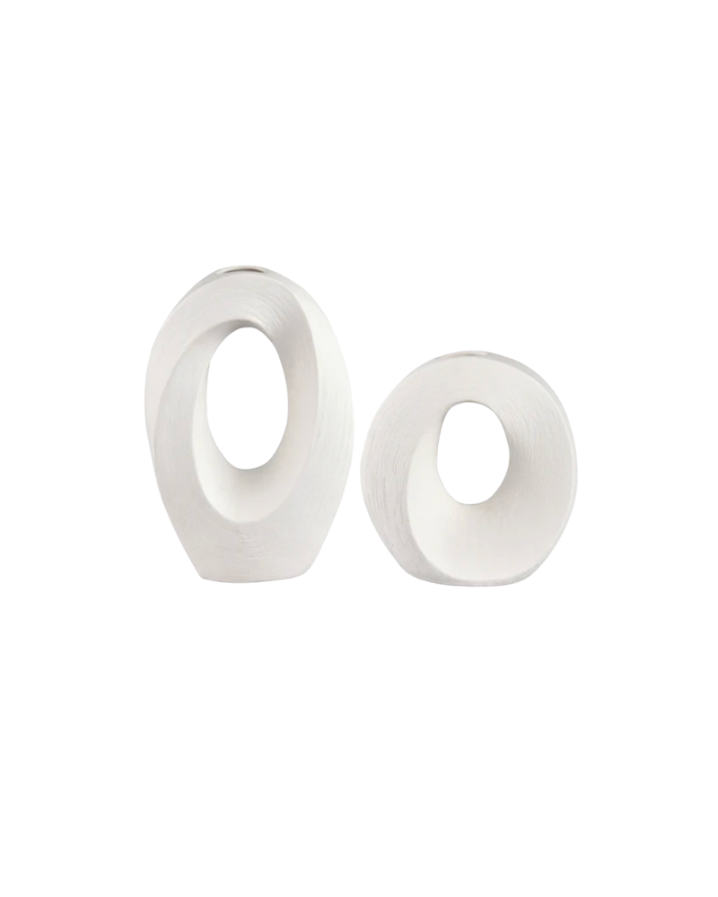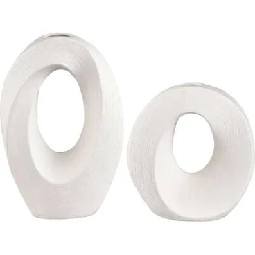 The Allora Vase by Elk Home features a sculptural ring shape with an open center and a small mouth opening. Crafted from earthenware, it creates a striking statement with or without flowers, making it a versatile décor piece. Sold separately, it's a stunning addition to any room.