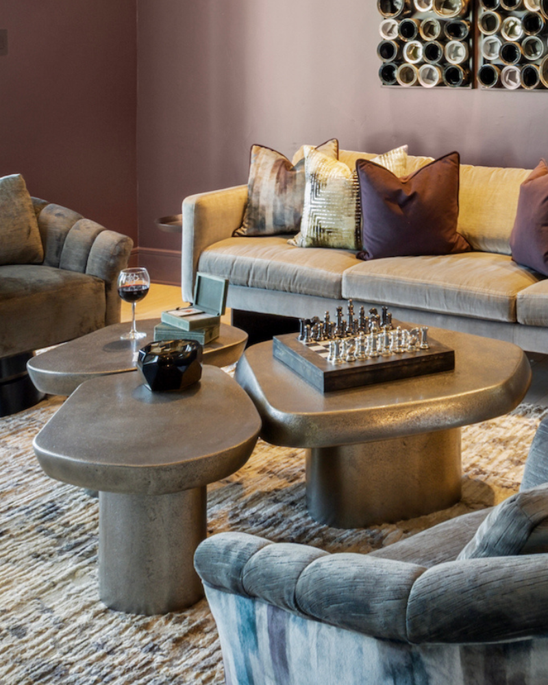 The Cocktail Table – Silver features a sculptural silhouette in cast aluminum, finished in a modern Graphite tone. Its free-form, irregular pentagon top rests on a shaped pedestal base, delivering an organic, artistic statement. As part of a trio of interlocking cocktail tables, this piece works beautifully as a stand-alone accent or layered with the full set for added dimension and versatility. Adjustable glides ensure seamless placement on any surface.
