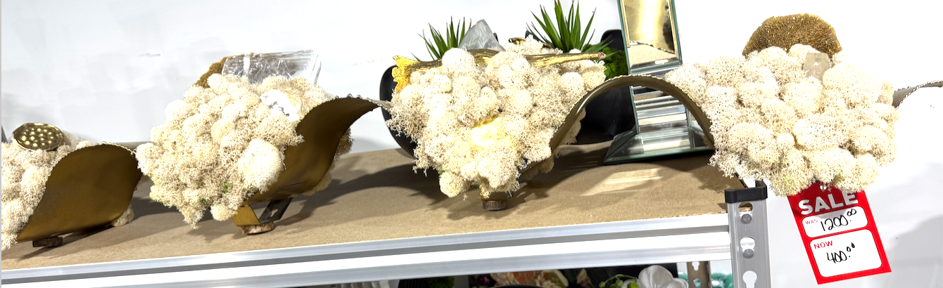 Custom Long Gold Wavy Floral featuring white moss, white and clear stones, gold sticks and seed pods.