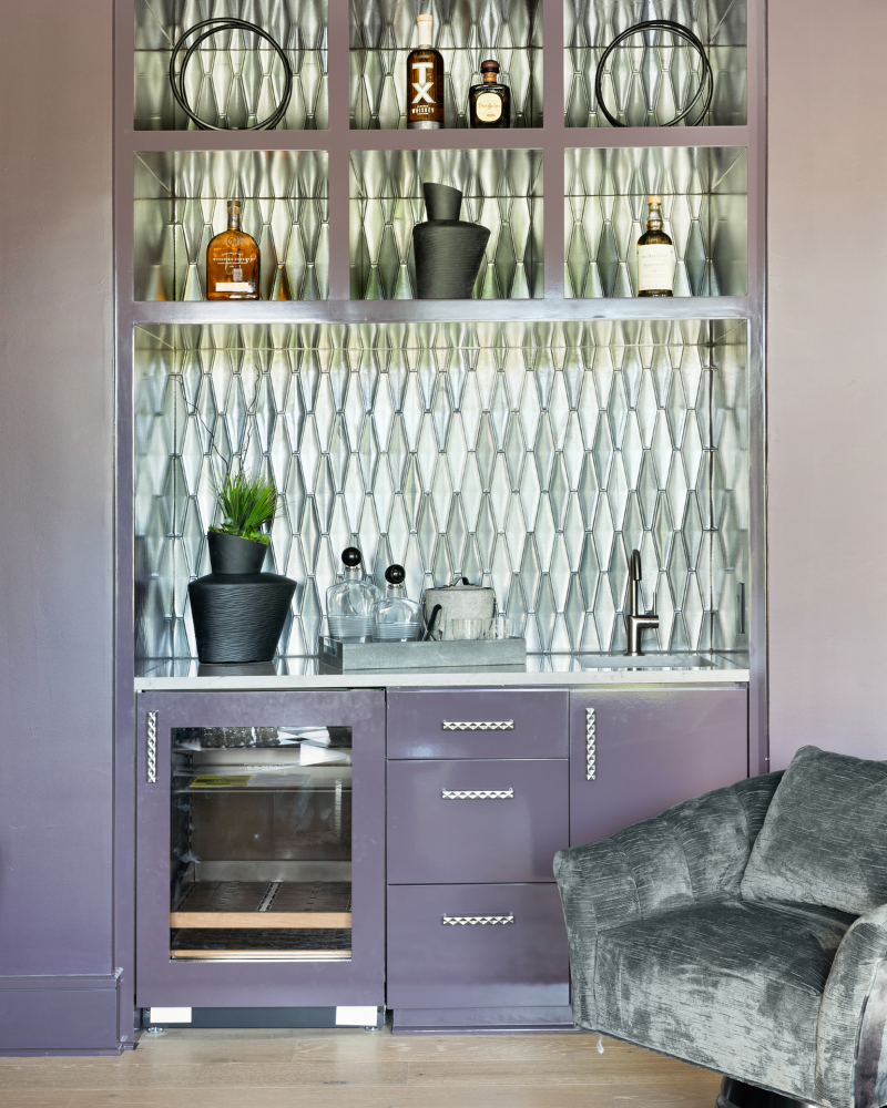 The Eaves Decanters - Gray are a modern nod to classic mid-century barware, crafted from clear leaded glass with subtle etched detailing for added texture and refinement. Each is topped with a sculptural Bengal marble stopper, bringing a natural contrast to the sleek silhouette. Perfect for styling on a bar cart, console, or built-in, this elegant pair adds understated sophistication to any space. Finish will vary.
