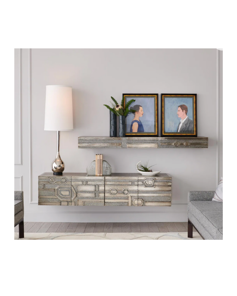 The Abstract Block Floating shelf is made of wood and covered in a metal sheet with a protective coating. It features a post modern geometric relief pattern.
