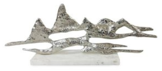 This handcrafted, three-dimensional landscape sculpture has a nickel finish and is mounted on a white marble base.
