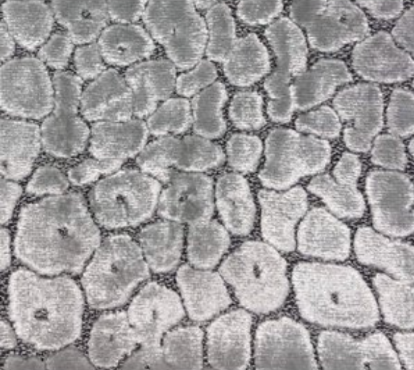 A bold, tactile velvet with a metallic pewter palette and distinctive spotted pattern.