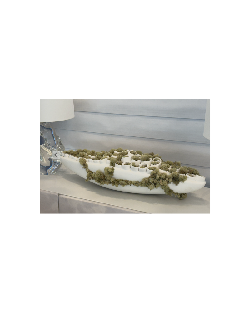 This sculptural faux moss arrangement features a soft white vessel filled with organic, textured moss elements that create a natural, layered look. The elongated form adds visual interest while the lush green tones bring an earthy, calming presence to consoles, shelves, or dining surfaces. A timeless accent that delivers the beauty of nature with effortless, maintenance-free styling.