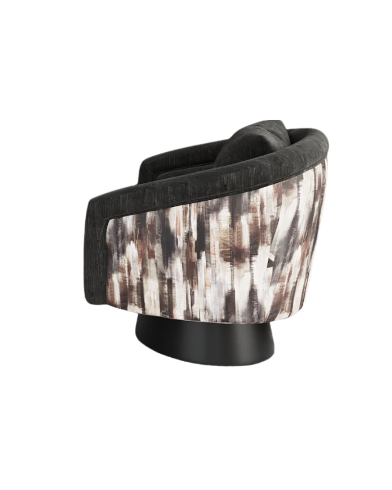 The Swivel Chair – Gray offers a tailored blend of comfort and style, wrapped in two sophisticated fabrics for added depth. The outside is upholstered in Milagro Slate, while the inside features Navarro Pewter, giving the chair a refined dual-texture appeal. With a black lacquer finish and smooth swivel base, this chair makes a sleek yet inviting statement—perfect for modern living spaces or stylish home offices.