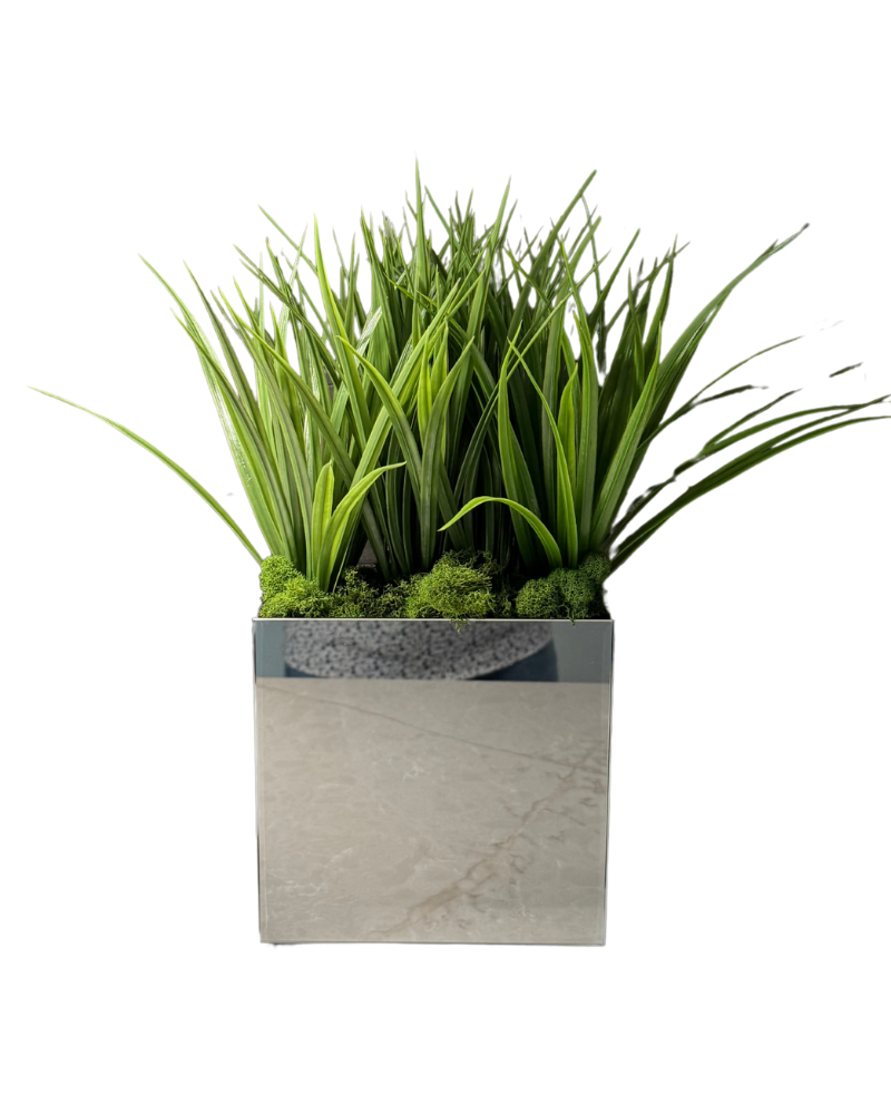 Add a clean and modern touch to any space with this custom faux grass arrangement, designed in-house by the SSI Floral team. Nestled in a sleek mirrored container, this piece brings texture, greenery, and reflective shine without the need for maintenance. Ideal for laundry rooms, bathrooms, or compact counters where you want a pop of nature-inspired décor with a contemporary edge.