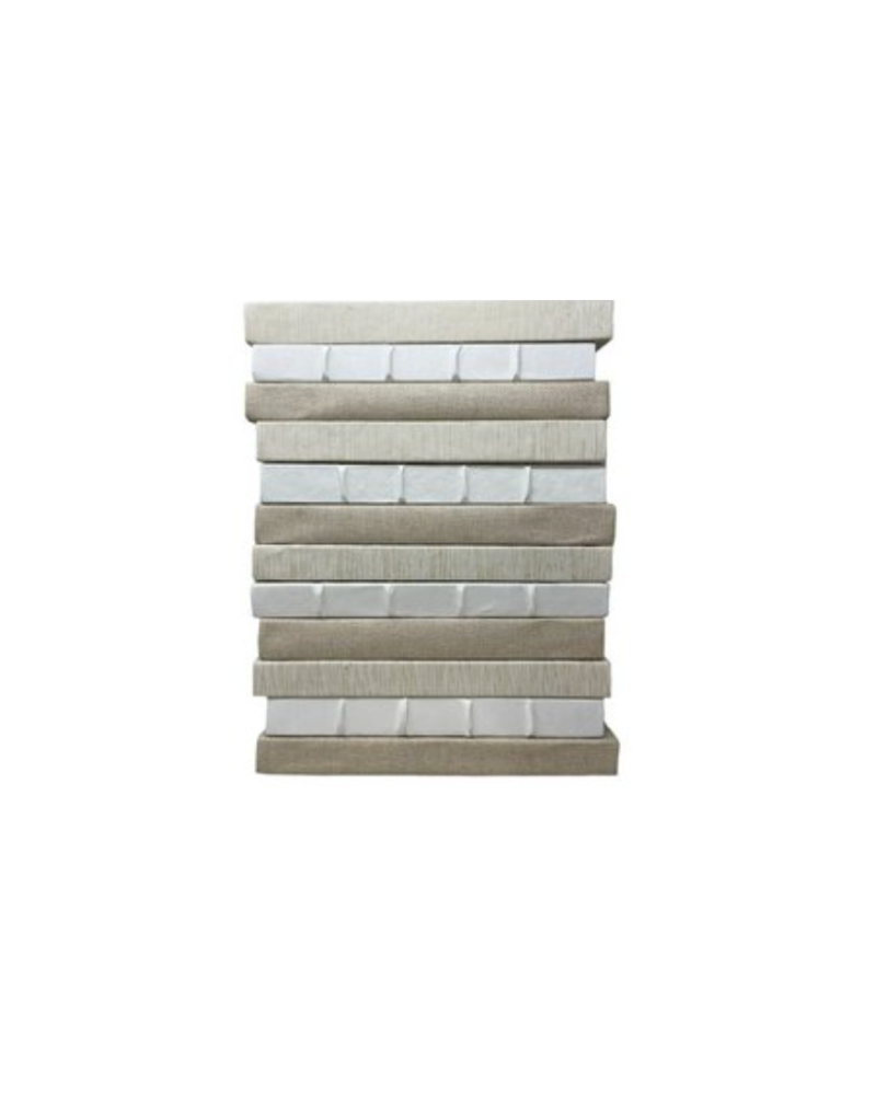 This collection is offered in three elevated variations: handmade white parchment with raised bands, a softly textured grasscloth, and a striated white metallic finish with subtle sheen.