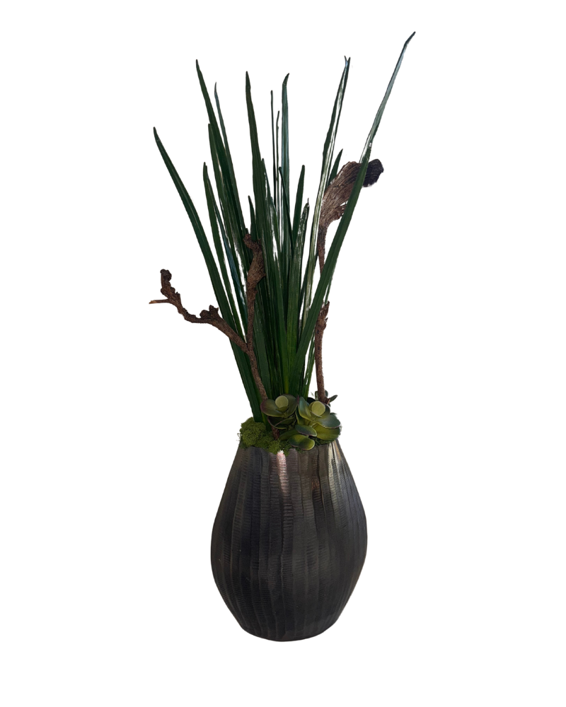 This arrangement beautifully combines height, texture, and natural appeal. Set in a hammered metal vase with a warm, dark finish, the design features tall, lifelike greenery paired with sculptural branches and soft succulents at the base. Accents of moss complete the composition, grounding the vertical elements with a lush, organic touch. With its dramatic silhouette and earthy materials, this piece serves as a striking focal point, effortlessly complementing a variety of interior styles while bringing the outdoors in—no maintenance required.