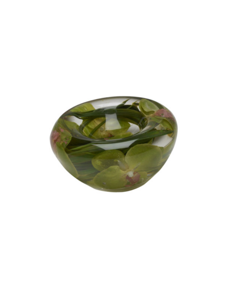 This pressed-flower glass bowl is a charming fusion of art and nature. Encased within the clear glass are delicate purple blooms and fern leaves, creating a captivating botanical display that feels both organic and timeless. Ideal as a decorative accent or a small catchall for jewelry or keepsakes, it adds a touch of natural beauty and artisanal craftsmanship to any tabletop or vanity.