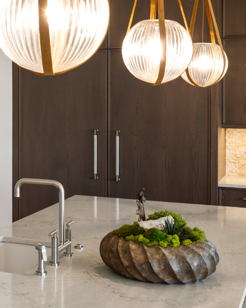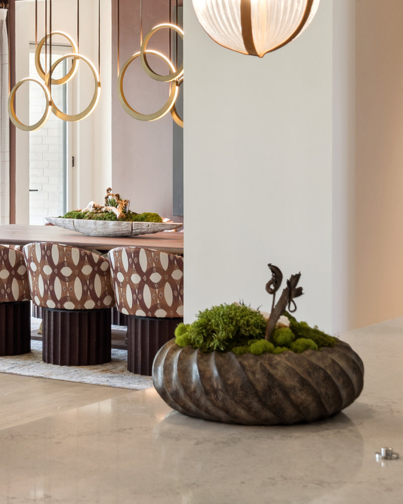 This arrangement beautifully combines organic texture and natural elegance. Set in a hand-carved wooden vessel with a softly ridged silhouette, the design features preserved moss, lifelike succulents, and a striking central geode that adds a raw, earthy brilliance. Sculptural wood accents extend from the base, creating movement and visual interest. With its lush greenery and nature-inspired materials, this piece serves as a stunning centerpiece, effortlessly complementing a variety of interior styles while offering a unique, maintenance-free botanical display.